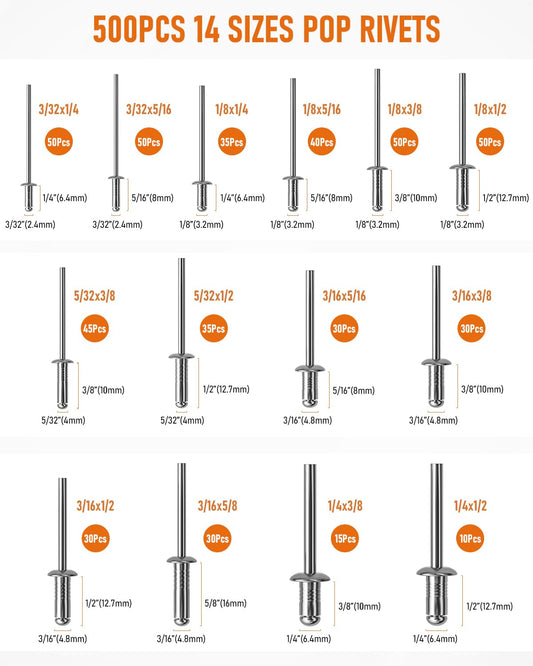 INCLY 1000PCS Aluminum Pop Rivets Assortment Kit, 14 Sizes Pop Rivets (3/32" 1/8" 5/32" 3/16" 1/4") with 5 Size 304 Stainless Steel Backup Washers, Assorted Blind Rivets for Metal with Storage Case