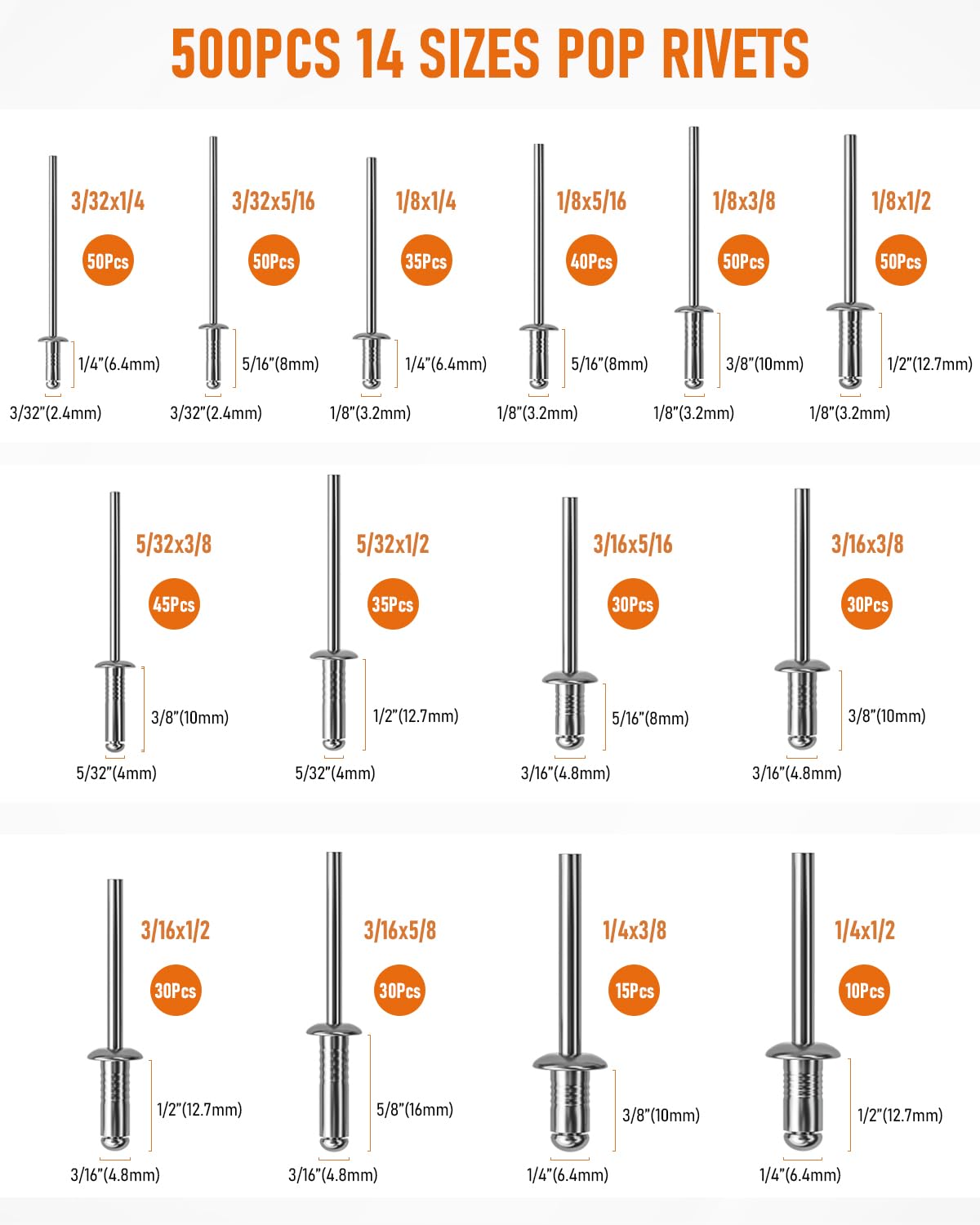 - 1000pcs Pop Rivets Set: This pop rivets assortment kit with washers set includes 14 most used sizes for your various needs. Including 50pcs 3/32” x 1/4”, 50pcs 3/32” x 5/16”, 35pcs 1/8” x 1/4”, 40pcs 1/8” x 5/16”, 50pcs 1/8” x 3/8”, 50pcs 1/8” x 1/2”, 45pcs 5/32” x 3/8”, 35pcs 5/32” x 1/2”, 30pcs 3/16” x 5/16”, 30pcs 3/16” x 3/8”, 30pcs 3/16” x 1/2”, 30pcs 3/16” x 5/8”, 15pcs 1/4” x 3/8”, 10pcs 1/4” x 1/2”, total 500 pcs. It also comes with 500 pcs 5 sizes backup washers.