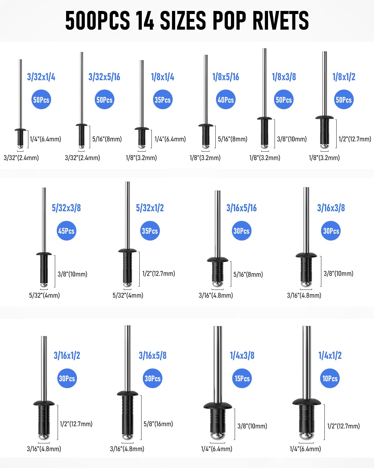 - 【1000pcs Black Rivets Kit】: This pop rivets assortment kit with washers set includes 14 most used sizes for your various needs. Including 50pcs 3/32” x 1/4”, 50pcs 3/32” x 5/16”, 35pcs 1/8” x 1/4”, 40pcs 1/8” x 5/16”, 50pcs 1/8” x 3/8”, 50pcs 1/8” x 1/2”, 45pcs 5/32” x 3/8”, 35pcs 5/32” x 1/2”, 30pcs 3/16” x 5/16”, 30pcs 3/16” x 3/8”, 30pcs 3/16” x 1/2”, 30pcs 3/16” x 5/8”, 15pcs 1/4” x 3/8”, 10pcs 1/4” x 1/2”, total 500 pcs. It also comes with 500 pcs 5 sizes backup washers.