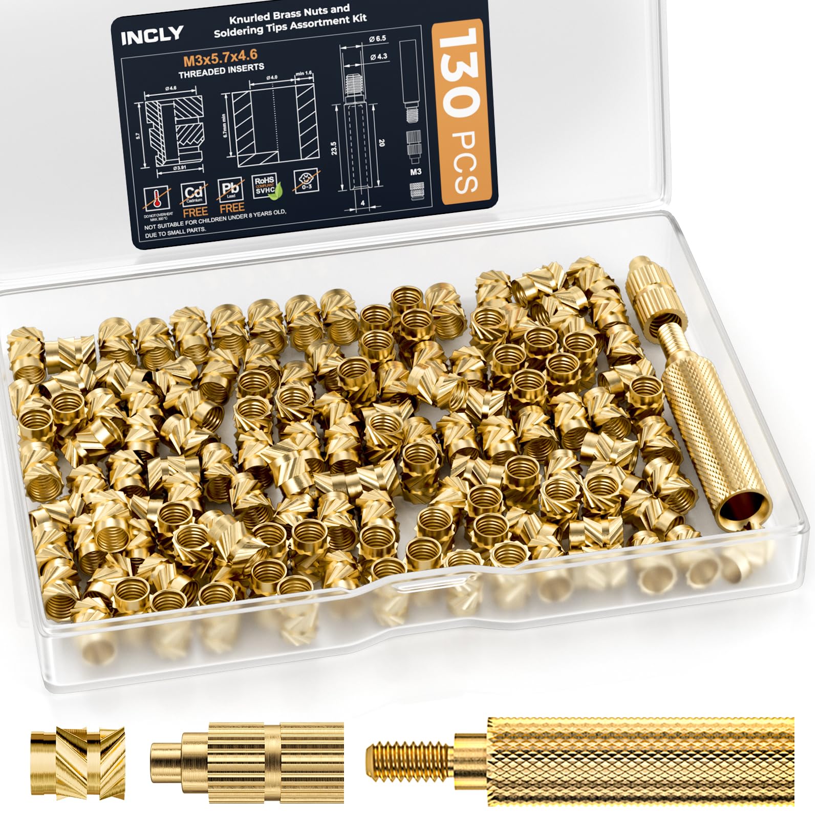 INCLY 130PCS M3 Heat Set Inserts, with Soldering Iron Tip and Adapter, M3x5.7 Female Thread Metric Knurled Nuts Assortment Kit, Brass Threaded Inserts for Plastic 3D Printing Components