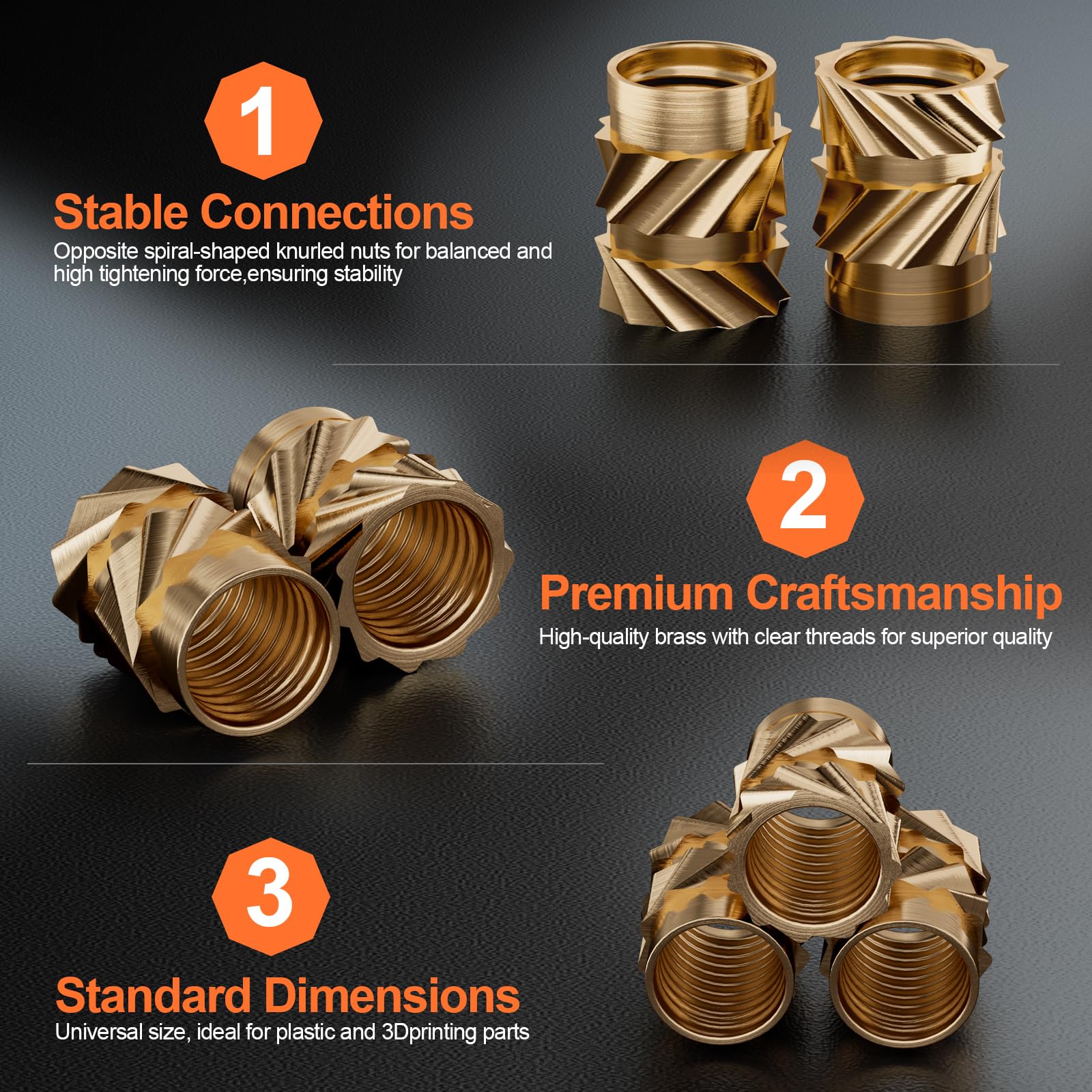 - 【M3 Heat Inserts Wide Applications】 Ideal for a wide range of 3D printing filaments, including PLA, PETG, ABS, PPS, PP, and more. Once the surrounding plastic cools and solidifies, the knurled brass sleeve forms a permanent, rock-solid anchor within the part.