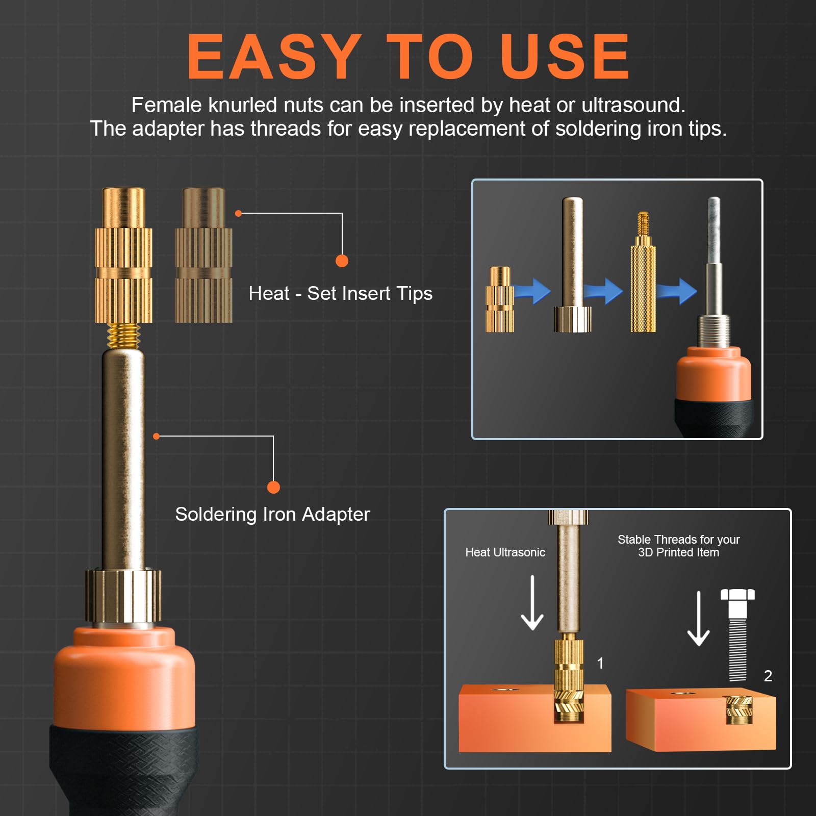 - 【Convenient M3 Threaded Insert Kit】This m3 heat set inserts includes 130 x M3x5.7 brass inserts, 1x soldering tip and 1 x adapter. Each heat set insert featuring an M3 internal thread and a 5.7 mm length. Designed for both heat and ultrasonic embedding methods, these nuts provide a reliable threading solution for your 3D printing projects.