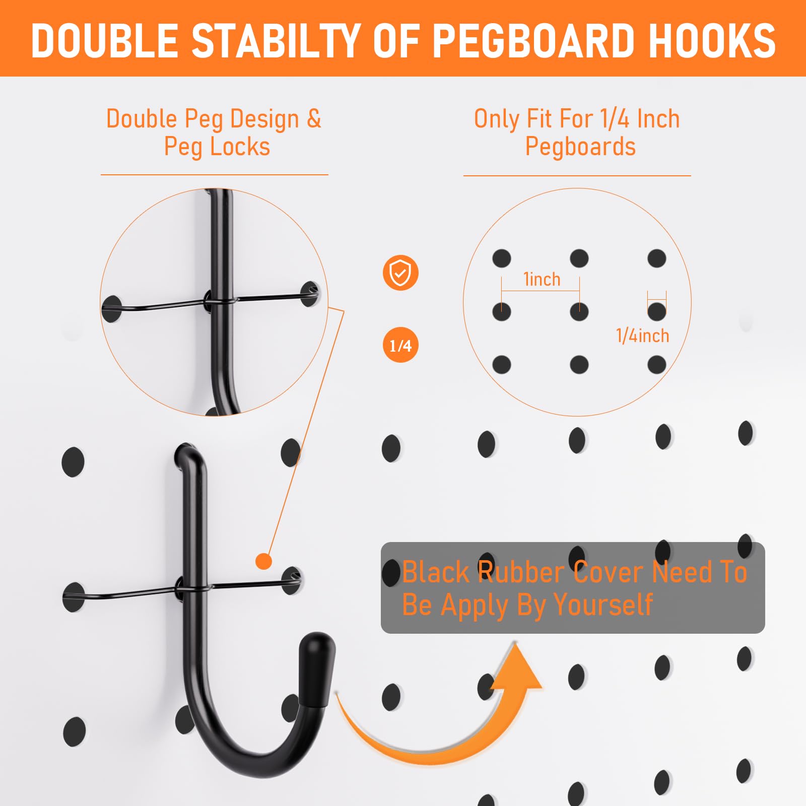- 1/4 INCH PEGBOARD HOOKS: The black pegboard accessories are great for metal and non-metal pegboards. 0.2 inch thick diameter to fit your 1/4'' holed pegboard securely. Also fits for wall control pegboards. The peg locks further strengthen the stability of the hook on pegboard