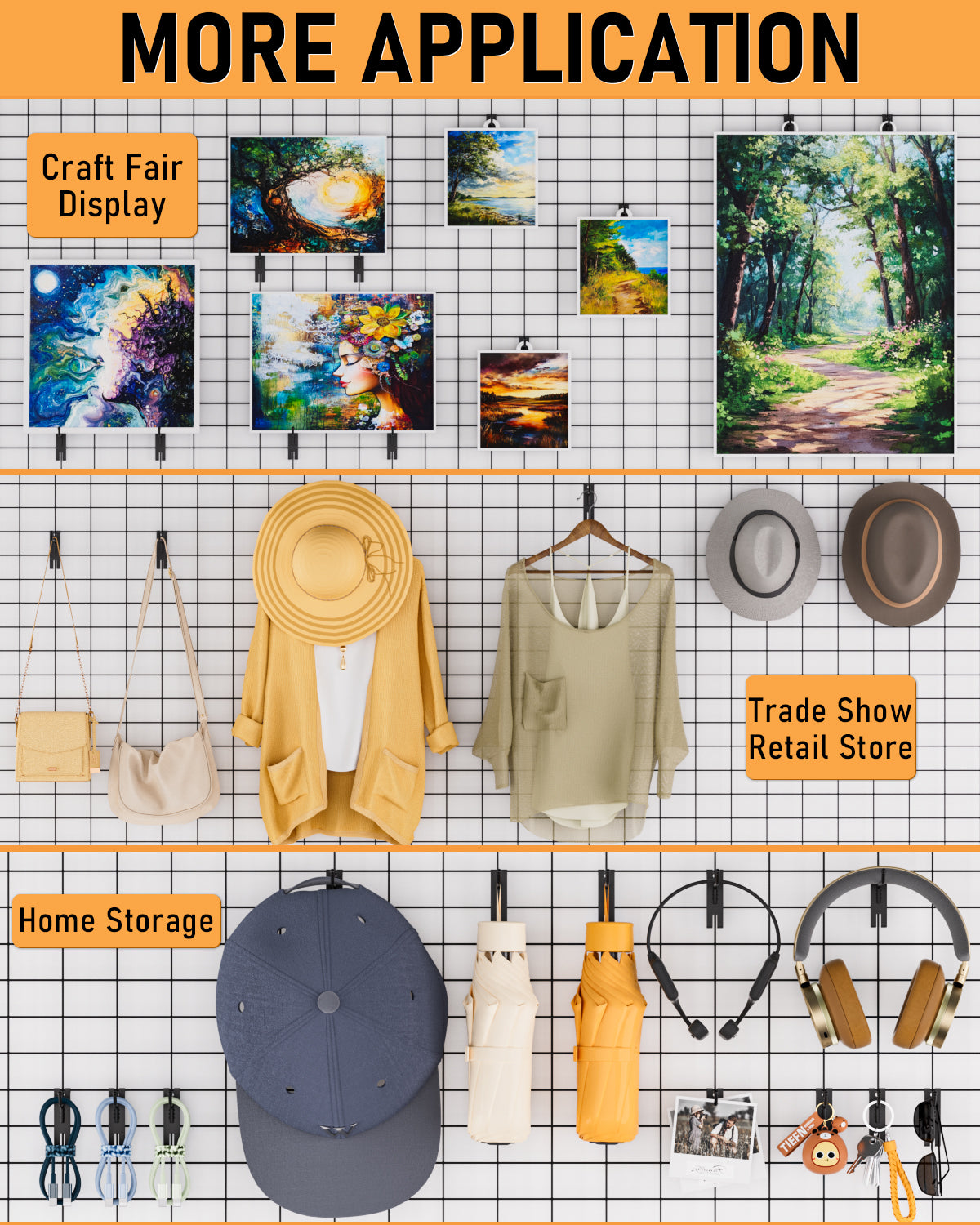 - WIDE APPLICATION: The INCLY black gridwall hooks are ideal for retail store to display goods like clothes, hats and bags or craft fair for showing paintings. Also a great storage solutions on a wide range of garage, living room, kitchen, basement, tool sheds and warehouse