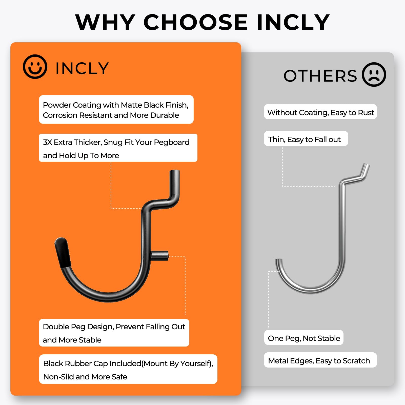 - 3X EXTRA THICK: This pegboard hooks are made of hardened steel construction with powder coating to get matte black finish, corrosion-resistant and rust-resistant. Up to 3x thick and 3x assortment weighs than competing products .Each hook has double stabilizing peg to prevent shaking and falling out