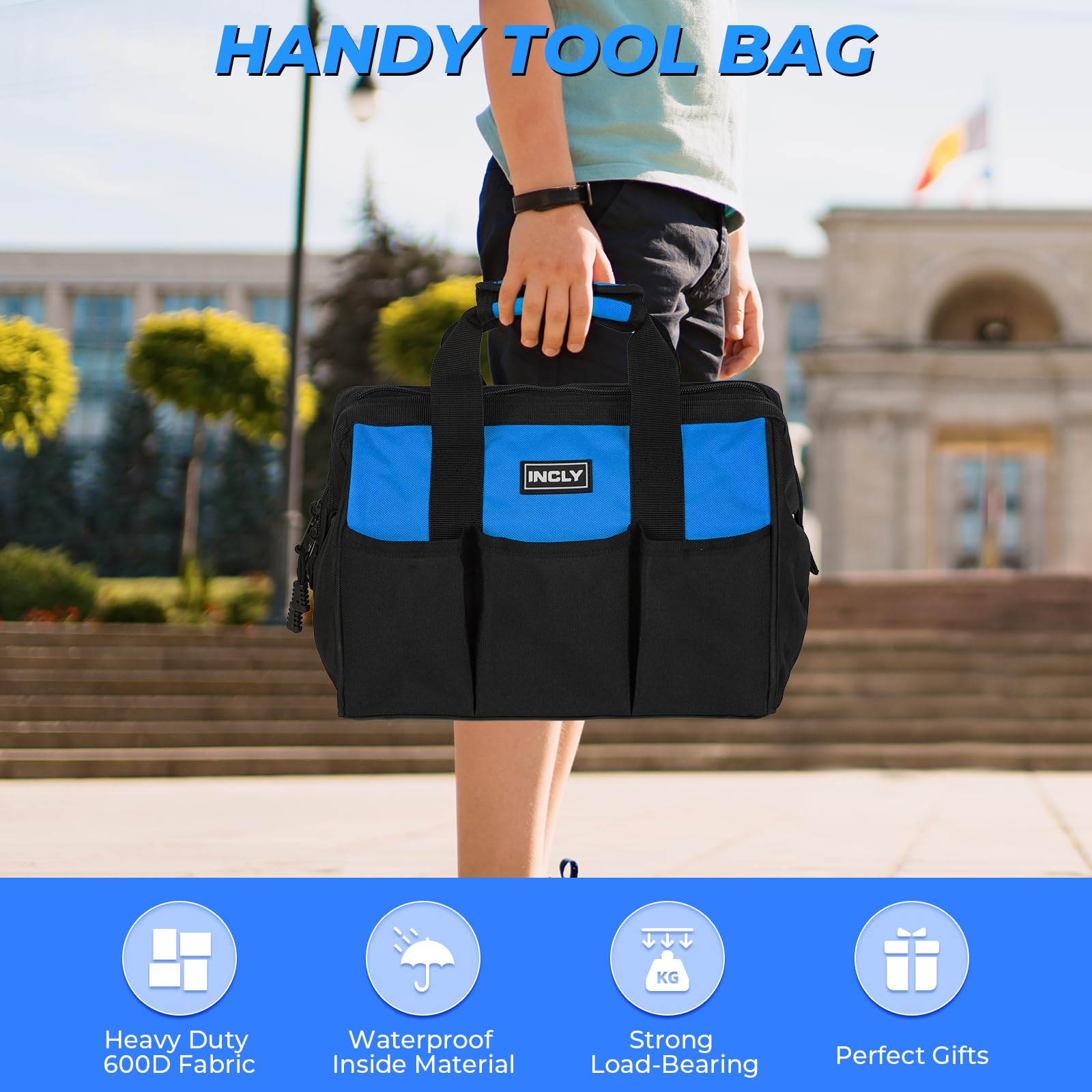 - Handy Tool Bag: The tool storage bag is made by heavy duty 600D fabric, durable for long time use. Designed with larger side pockets, it helps to store more tools when working, very convenient to access