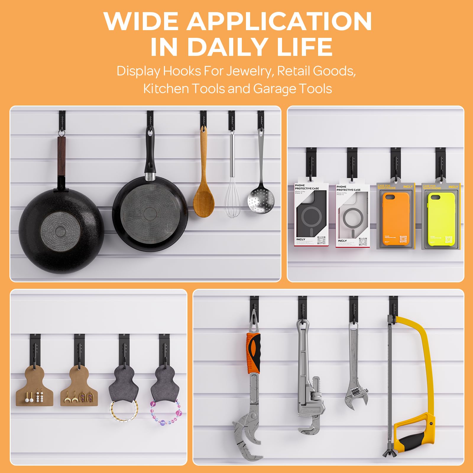 - PRACTICAL DESIGN: The slatwall hooks are J-shape design, preventing items from falling down. And the black rubber cap on the end protects your hands from scratches, convenient and safe for use