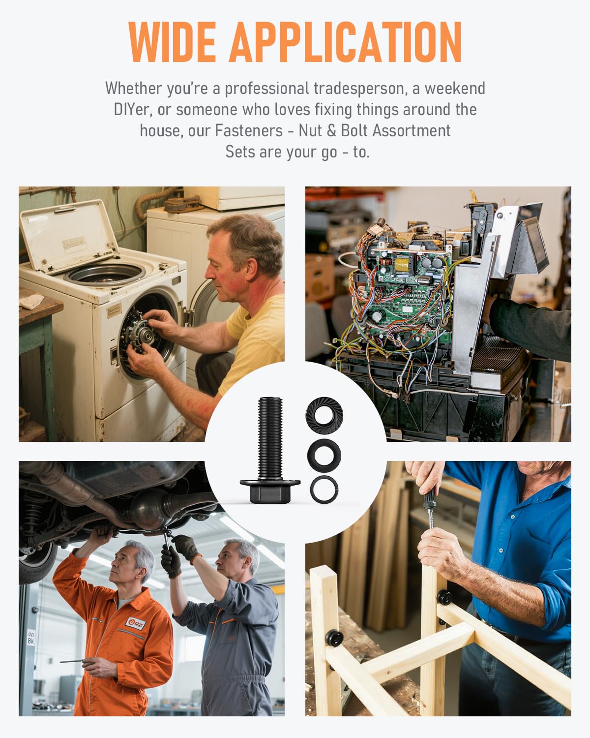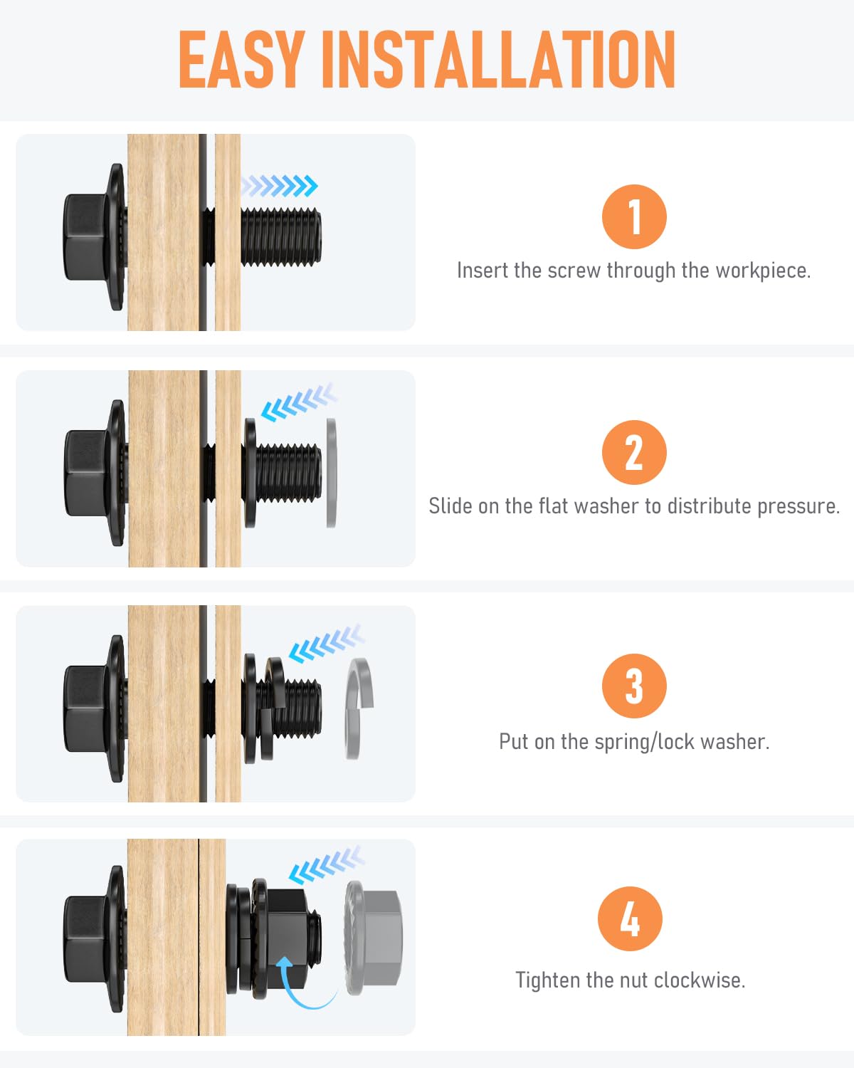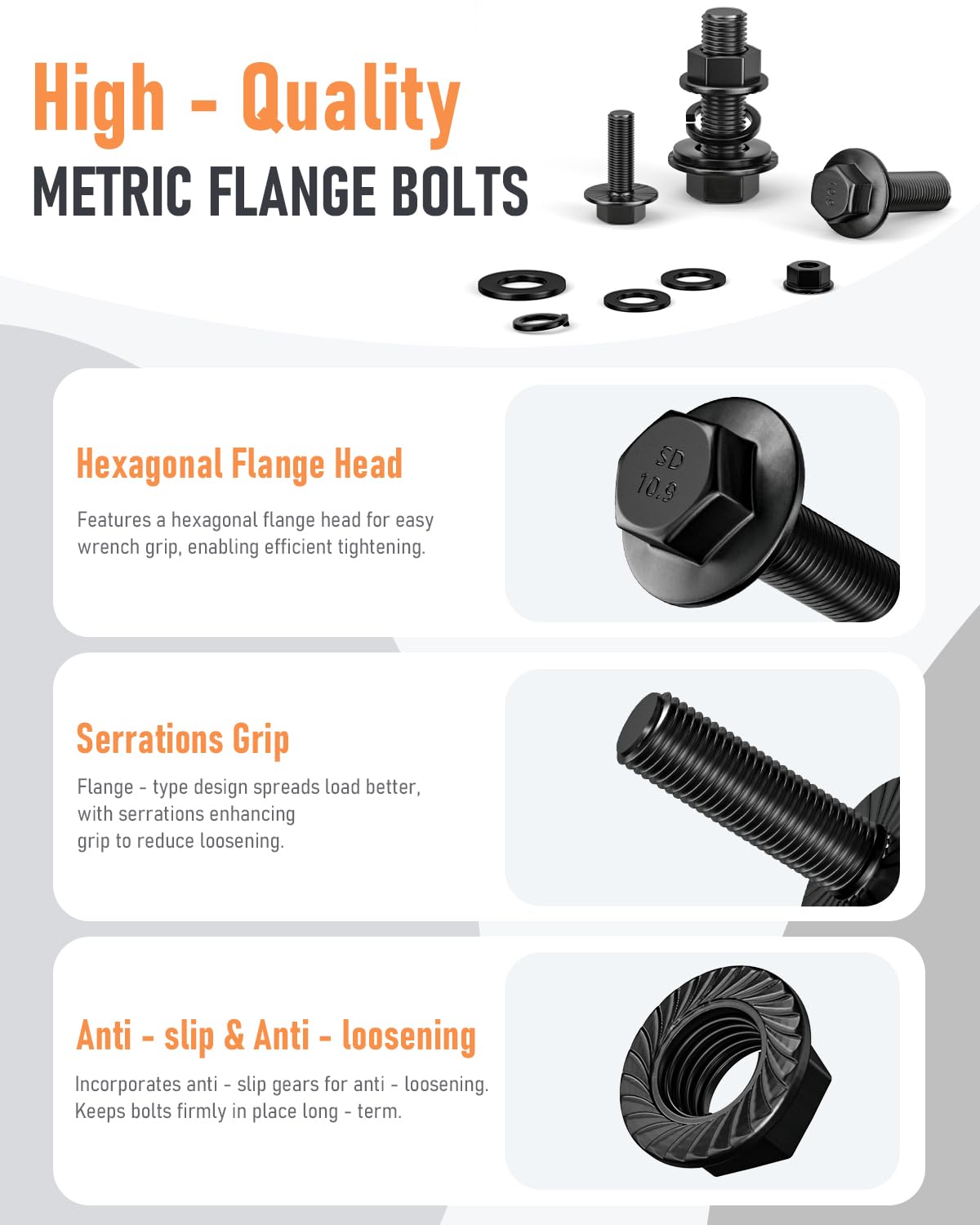 - Worry-free Service: In addition to screws, metric bolts and nuts assortment, lock washers and flat washers are also included. The lock washers can prevent the nuts from loosening, while the flat washers can distribute the pressure, protect the surface of the connected components, and improve the reliability of the connection. If you have any problems and questions about Incly black bolts and nuts kit, please feel free to contact us, we will make every effort for your matter.