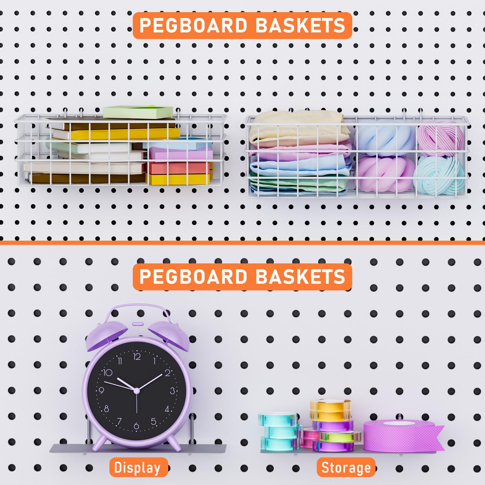 - Large Pegboard Baskets: Designed with size XL(13.5”x7.5”x4.5”) and L (12.5”x6.5”x4”), they have larger capacity to load more stuff and hold up to 30lbs. Also the peg board baskets are made of hardened steel construction with chrome plating finish to provide maximum strength, resist rust and corrosion