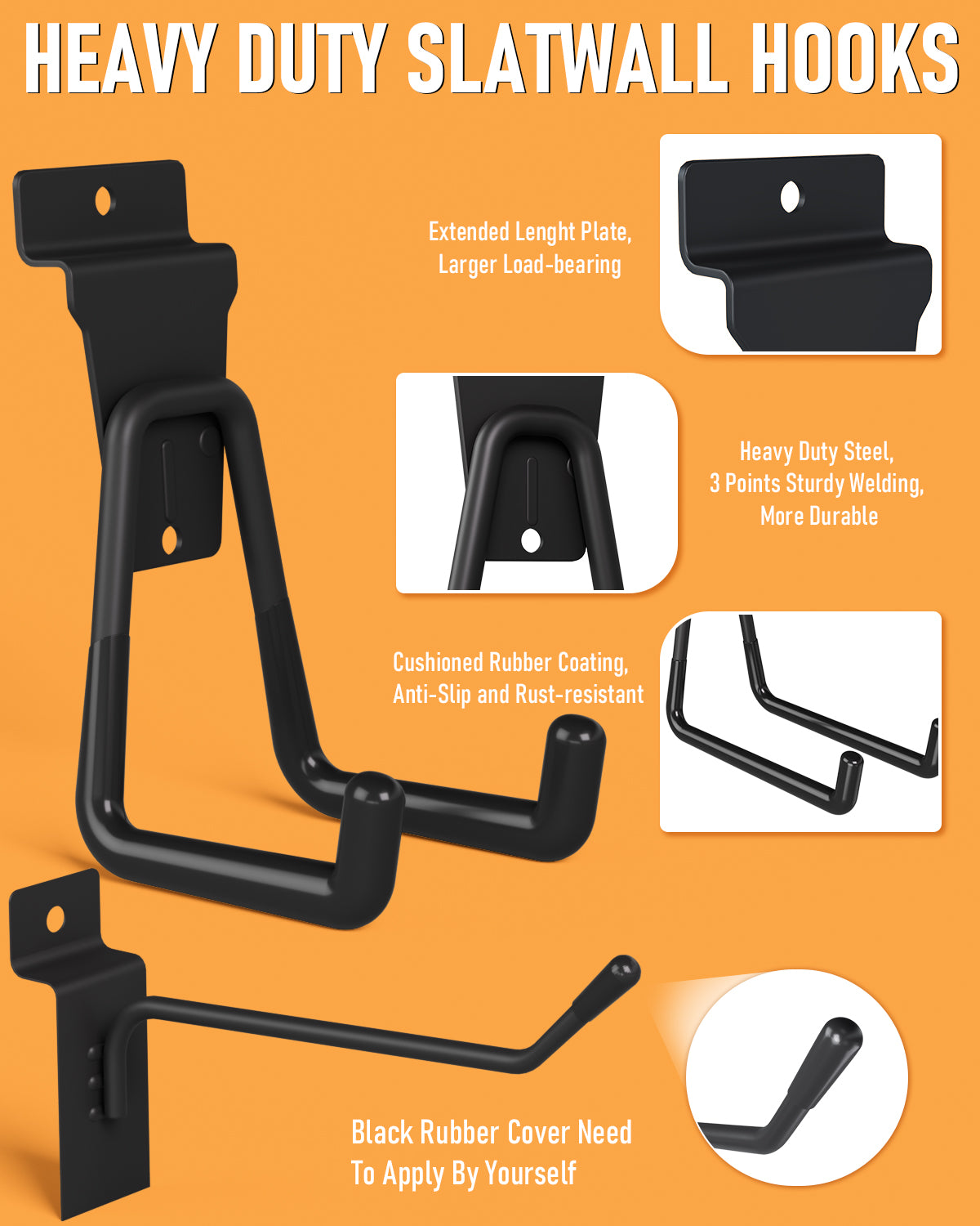 - STURDY & DURABLE: The slatwall baskets and slat wall hanging hooks are made of hardened carbon steel with vinyl coated and sturdy 3 points welding technique, which makes them sturdy and durable, corrosion-resistant and rust-resistant. The end of each hooks are designed with rubber cover to prevent from scratching
