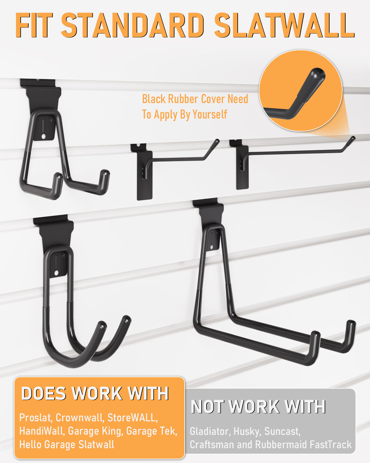 - FIT STANDARD SLATWALL: The INCLY slat wall hanging hooks are designed to fit standard slatwall panels like Proslat, Crownwall, StoreWALL, HandiWall, Garage King, Garage Tek, Hello Garage Slatwall. DO NOT FIT Brands: Gladiator, Husky, Suncast, Craftsman and Rubbermaid FastTrack. Please double check your slat wall before ordering