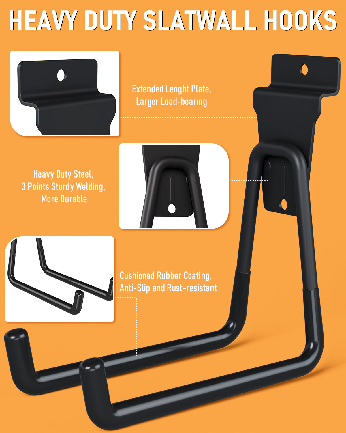 - STURDY & DURABLE : The slat wall hooks are made of heavy duty steel metal with sturdy 3 points welding technique, also with cushioned rubber coating, which makes them anti-slip and rust-resistant. It can be durably used for years with the slat wall paneling due to larger load-bearing