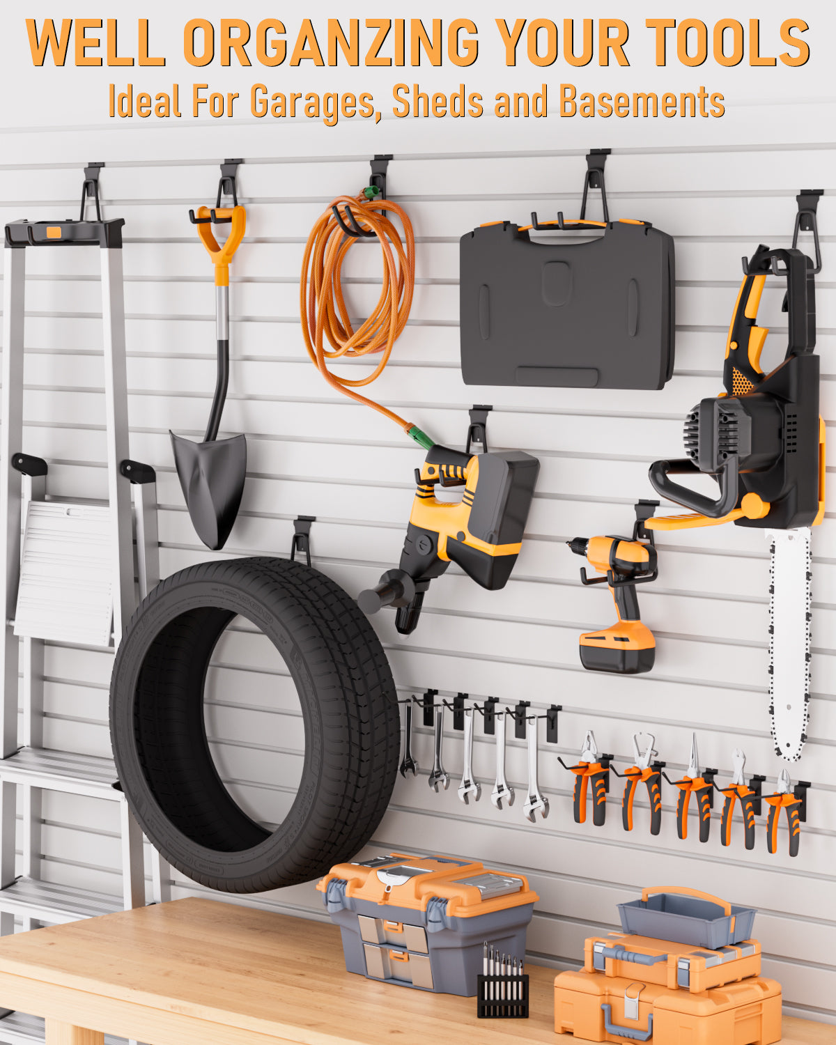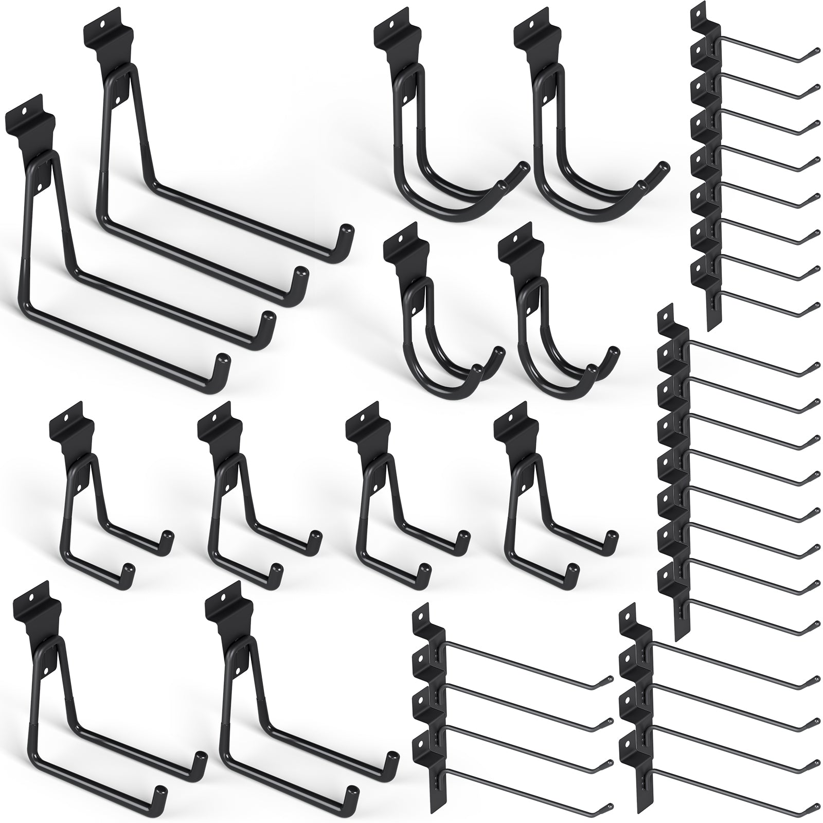 - SPACE SAVING: The black slatwall hooks could be arranged in a compact style on slat wall, save more space and get effortless accessible for a variety of tools or equipments. Ideal for storage solutions on a wide range of garage, workshop, basement, retail store, tool sheds, or warehouse