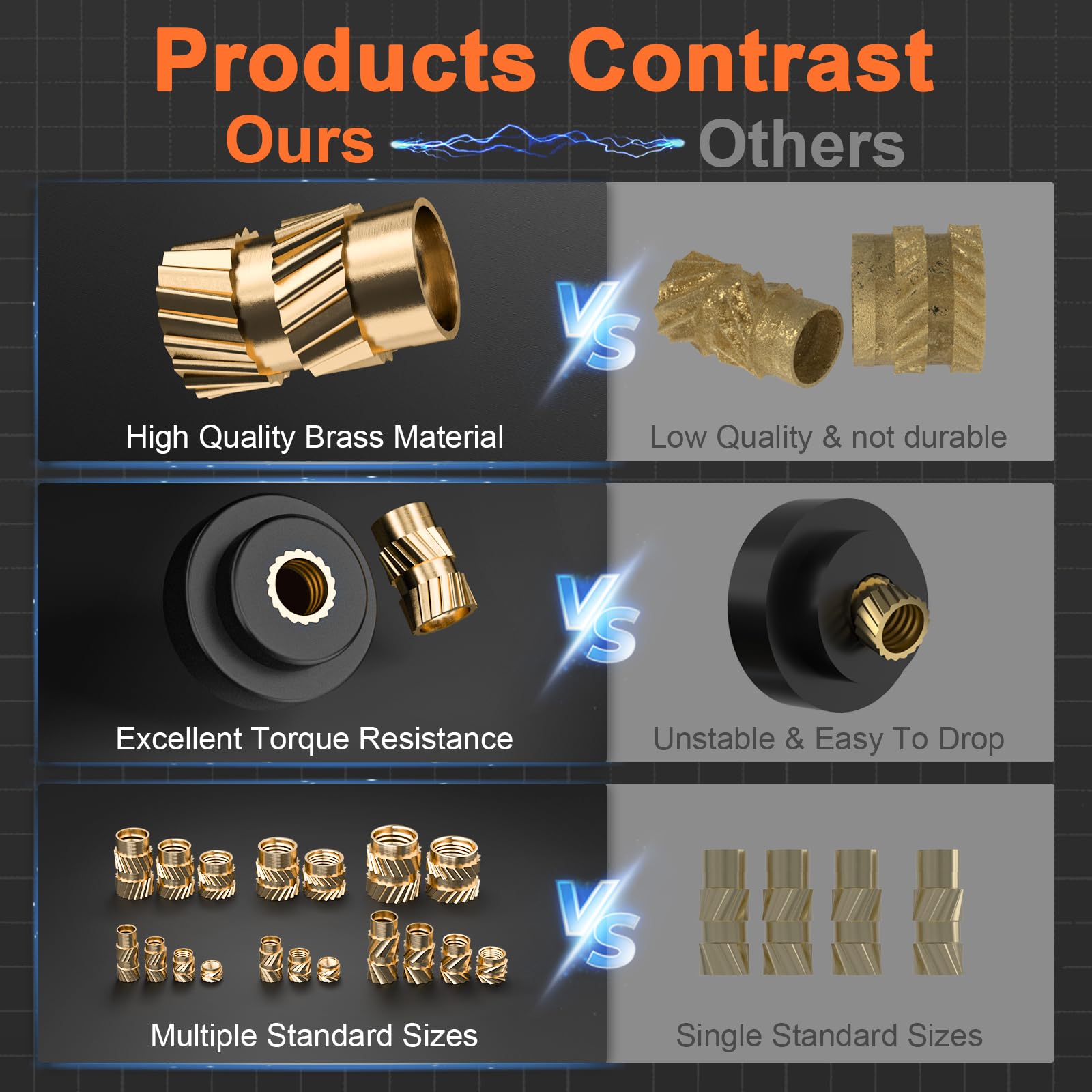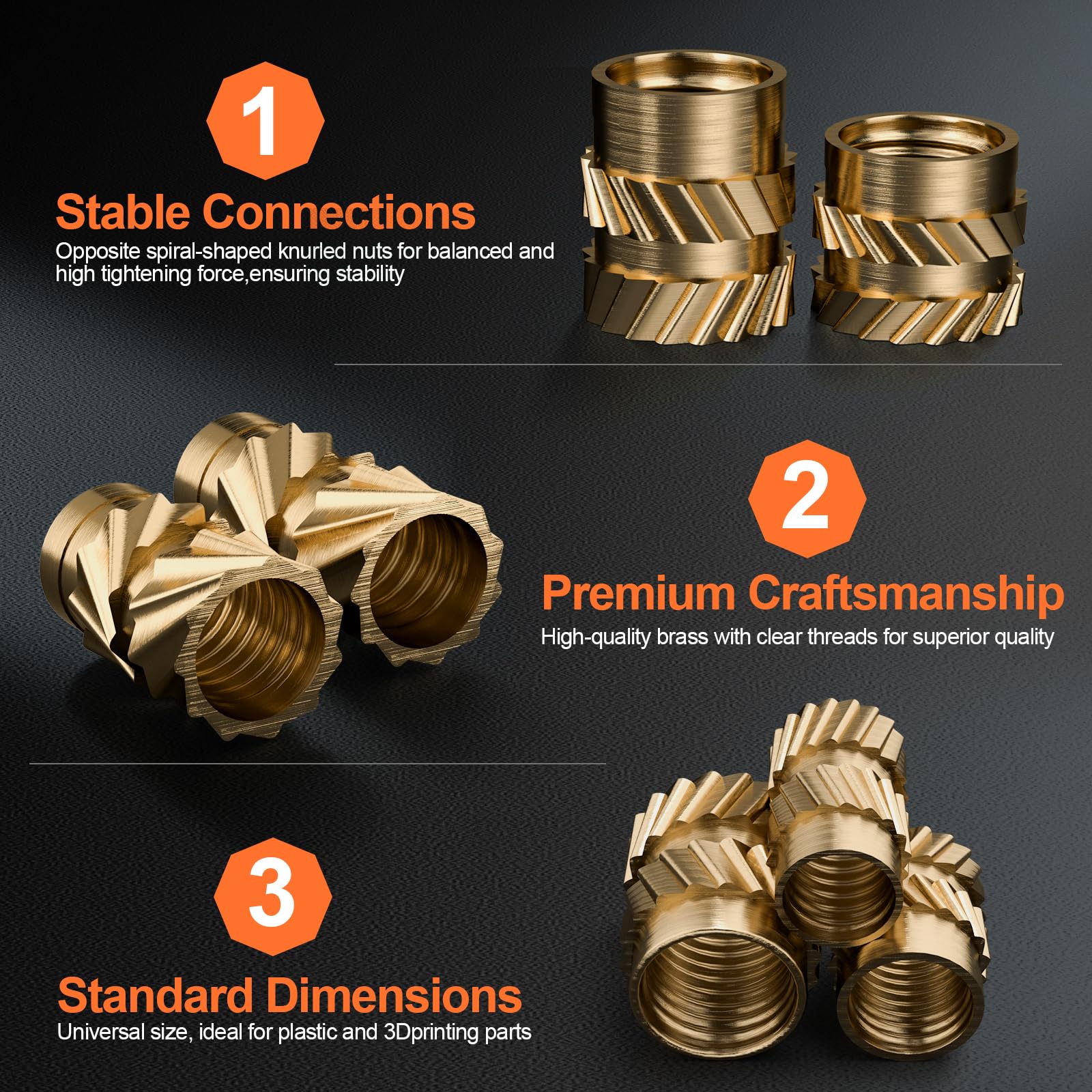 - 【Excellent Torque Resistance】The heat inserts exterior has a high-precision and clear thread knurling design,after the copper insert is thermally injected into the plastic part, due to the embossing process on the outer diameter of the product, it forms a certain friction force and bite force with the product after forming, which can ensure a high tightening force, making your work more convenient and efficient.