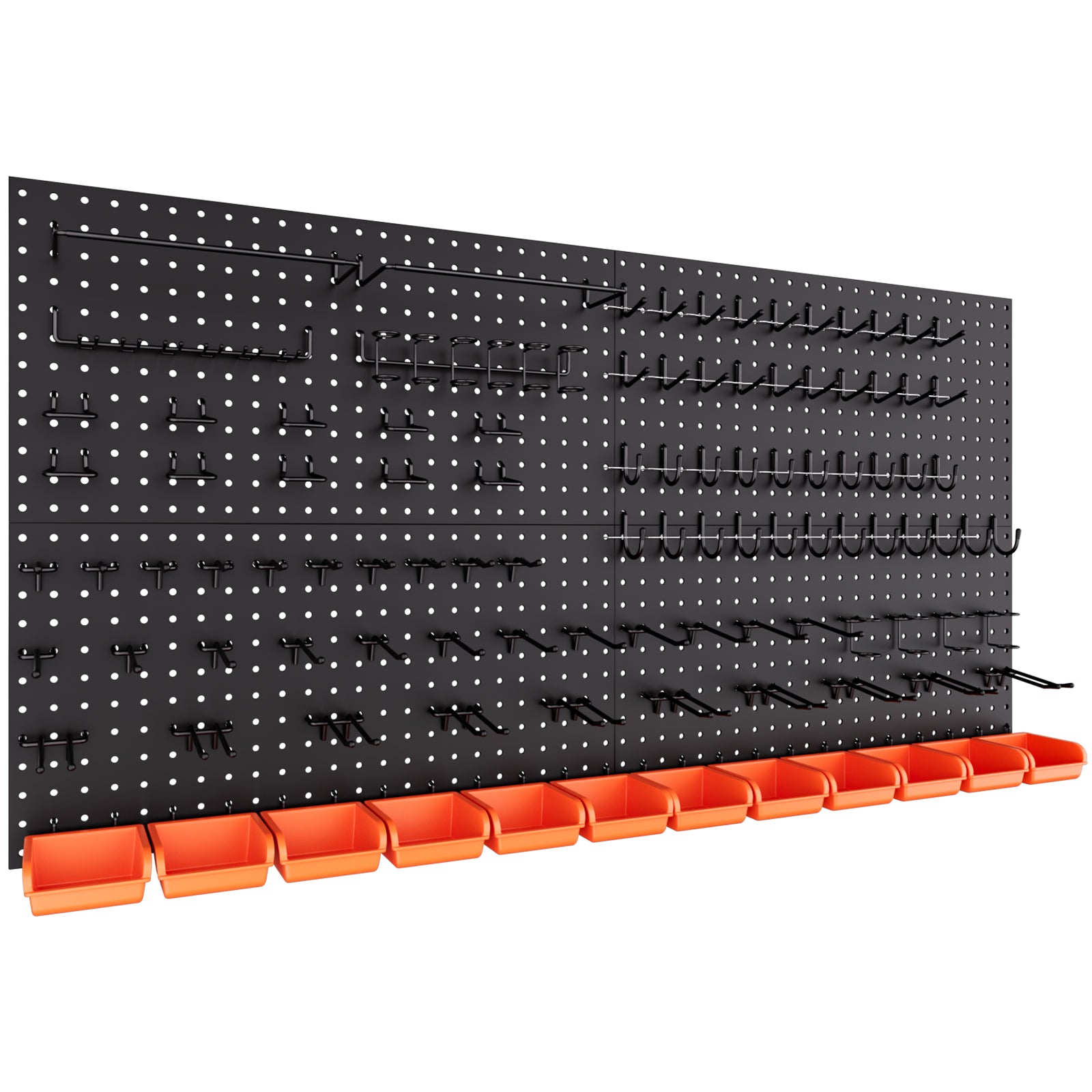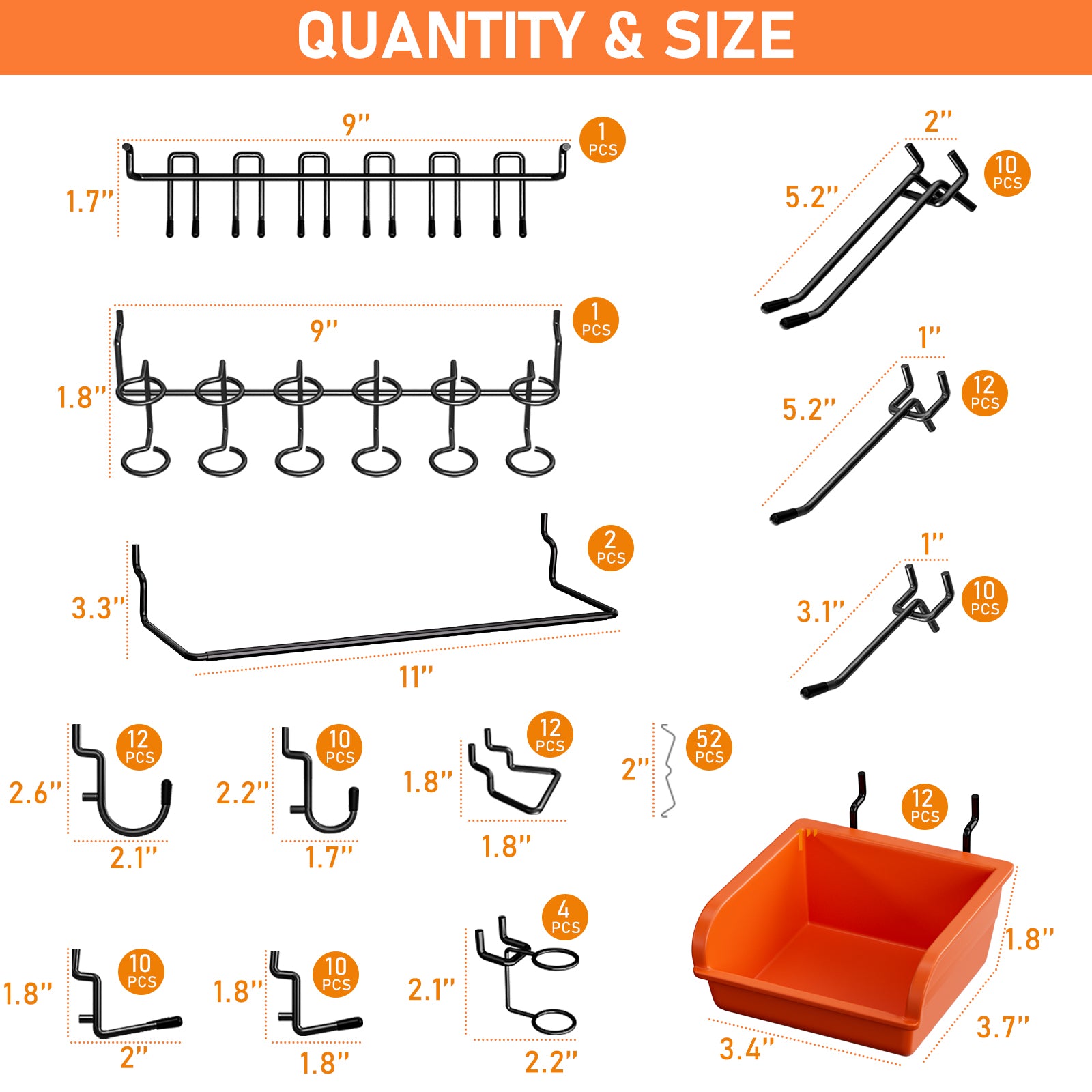 - PEGBOARD WITH HOOKS KIT: The pegboard wall organizer comes with 4pcs metal pegboard panels and 156pcs pegboard accessories, 13 different type pegboard hooks including 12pcs updated pegboard bins, curved hooks, angled hooks, straight hooks, and ring tool holder, multi tool rack. Also steel peg lock to double fit the hooks