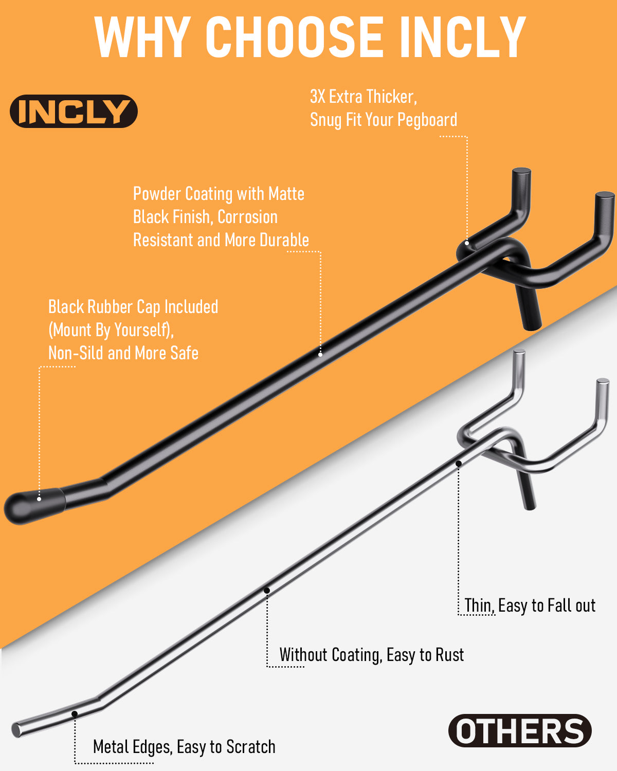 - WIDE APPLICATION: The INCLY 1/4 inch pegboard hooks are ideal for storage solutions on a wide range of garage, workbench, kitchen, craft room, sewing room, workshop, basement, store, tool sheds, warehouse. Or for displaying you stuff like earing or necklace