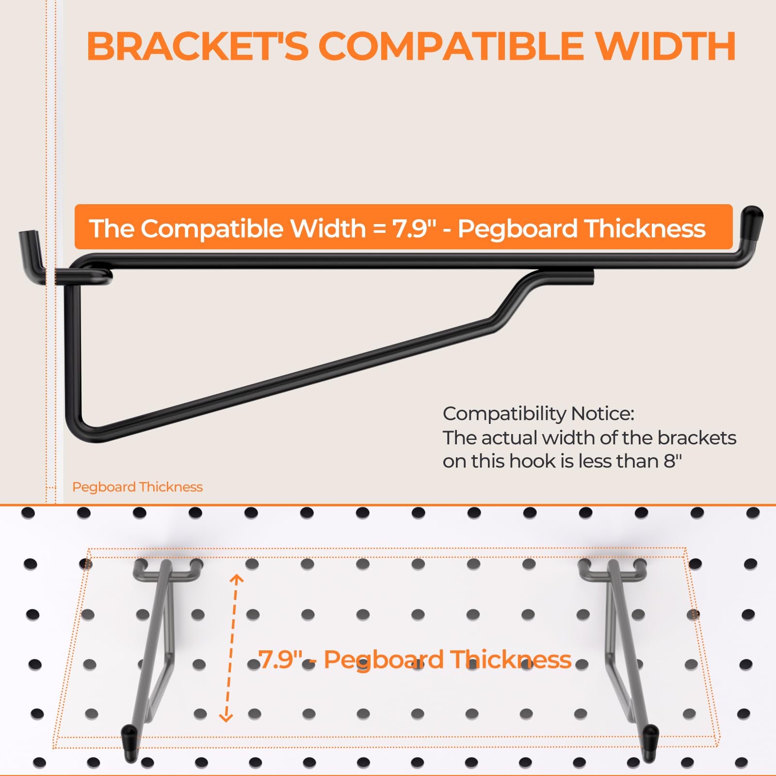 - COMPATIBILITY NOTICE: 8" pegboard shelf hooks do not directly fit 8" shelf board. Please consider the thickness of both shelves and pegboard. To ensure shelves lay flat, the compatible width = 7.9" - pegboard thickness.