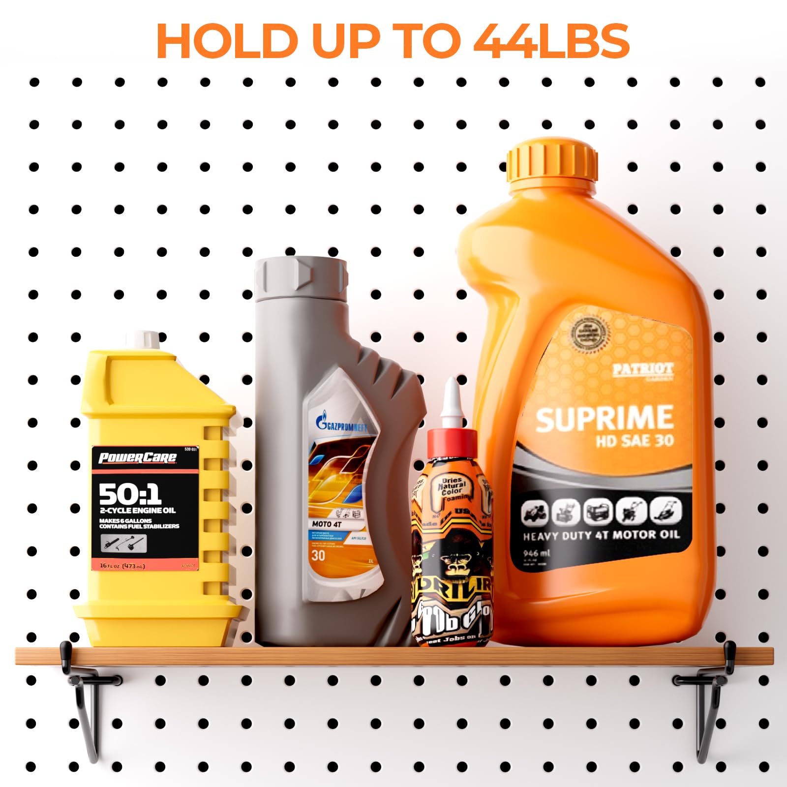 - 2X EXTRA THICK: These pegboard shelf brackets are made of hardened steel construction with powder coating to get matte black finish, more durable and corrosion-resistant. Up to 2x thick and 2x assortment weighs than competing products. Load bearing 44LBS
