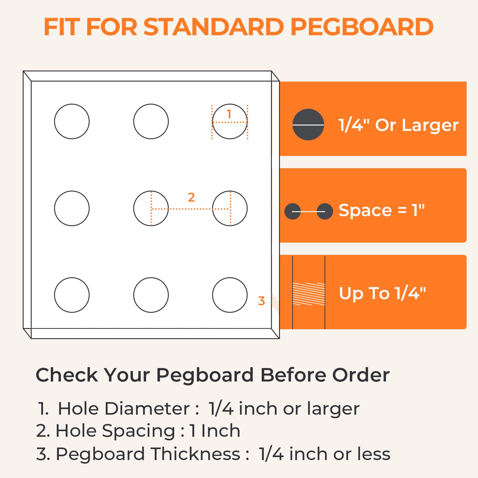 - UNIVERSAL FIT: Compatible with all standard pegboards featuring 1 inch hole spacing, hole diameter of 1/4 inch or larger, and pegboard thickness less than 1/4 inch