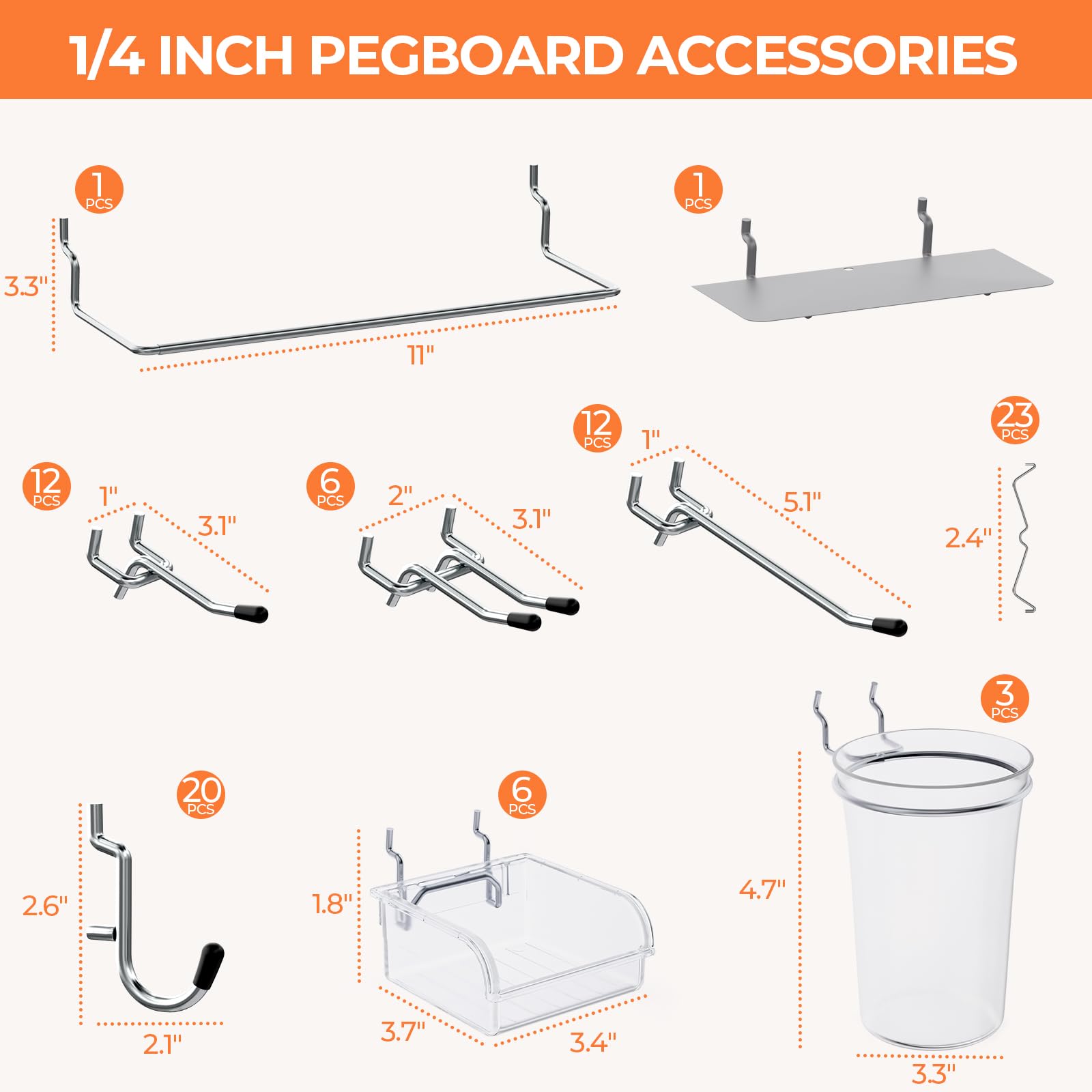 - 1/4 INCH PEGBOARD HOOKS: The peg board hooks are made of hardened steel construction to provide maximum strength, more sturdy and corrosion-resistant. Made of harder and thicker plastic, the pegboard bins and cups are installed with exclusive hooks to hang, sturdy for long time use