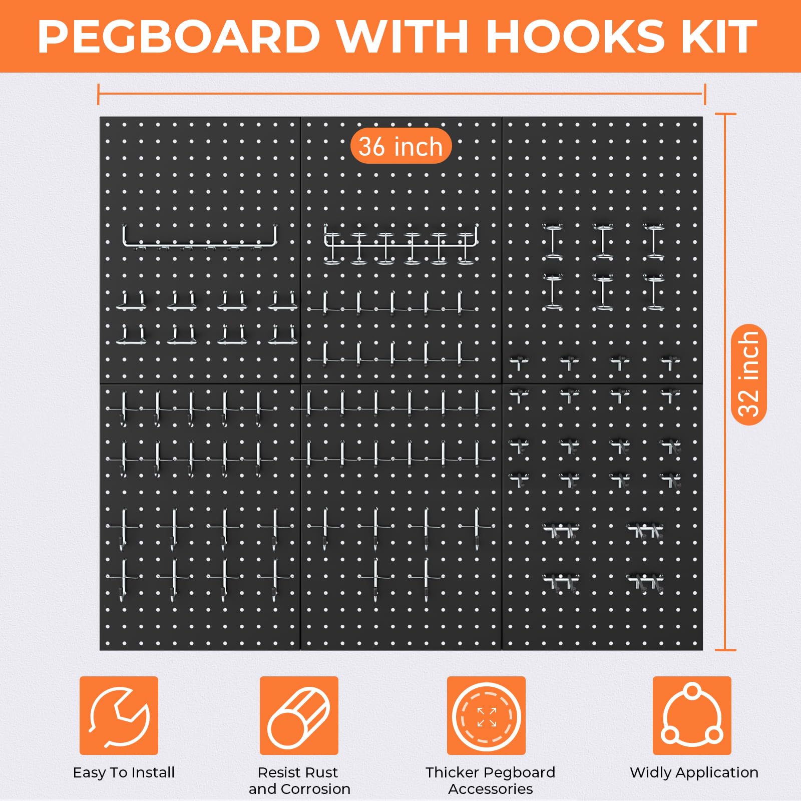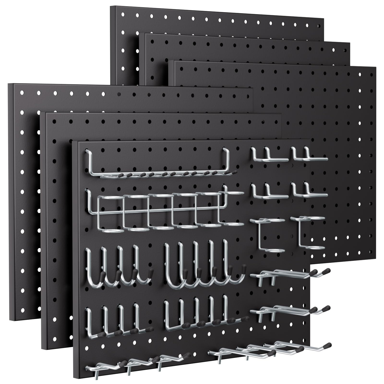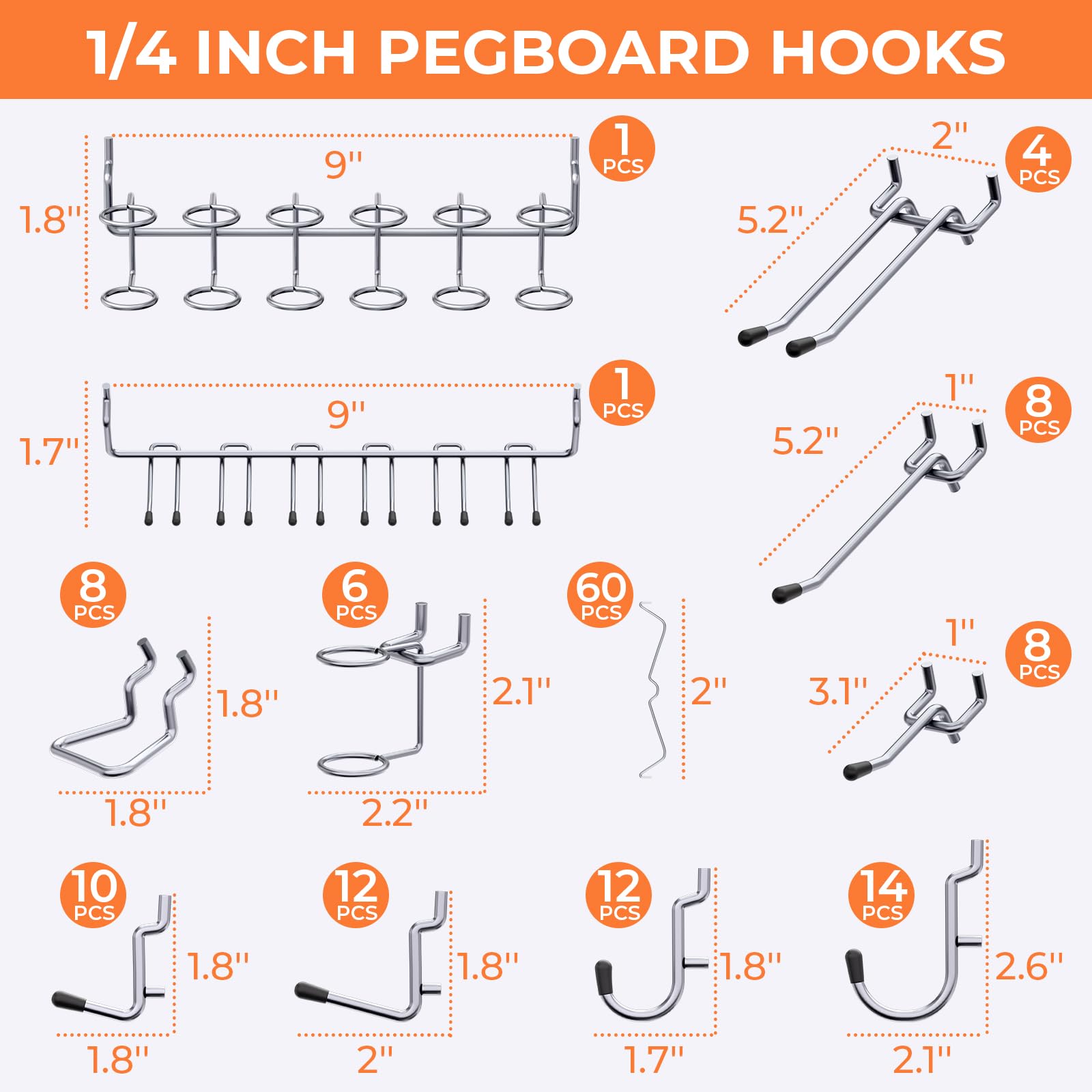 - PEGBOARD WITH HOOKS KIT: The pegboard wall organizer comes with 6pcs metal pegboard panels and 84pcs 1/4 Inch pegboard hooks in 12 different types, curved hooks, angled hooks, straight hooks, ring tool holder and multi tool rack. Also 60pcs steel peg lock to double fit the hooks