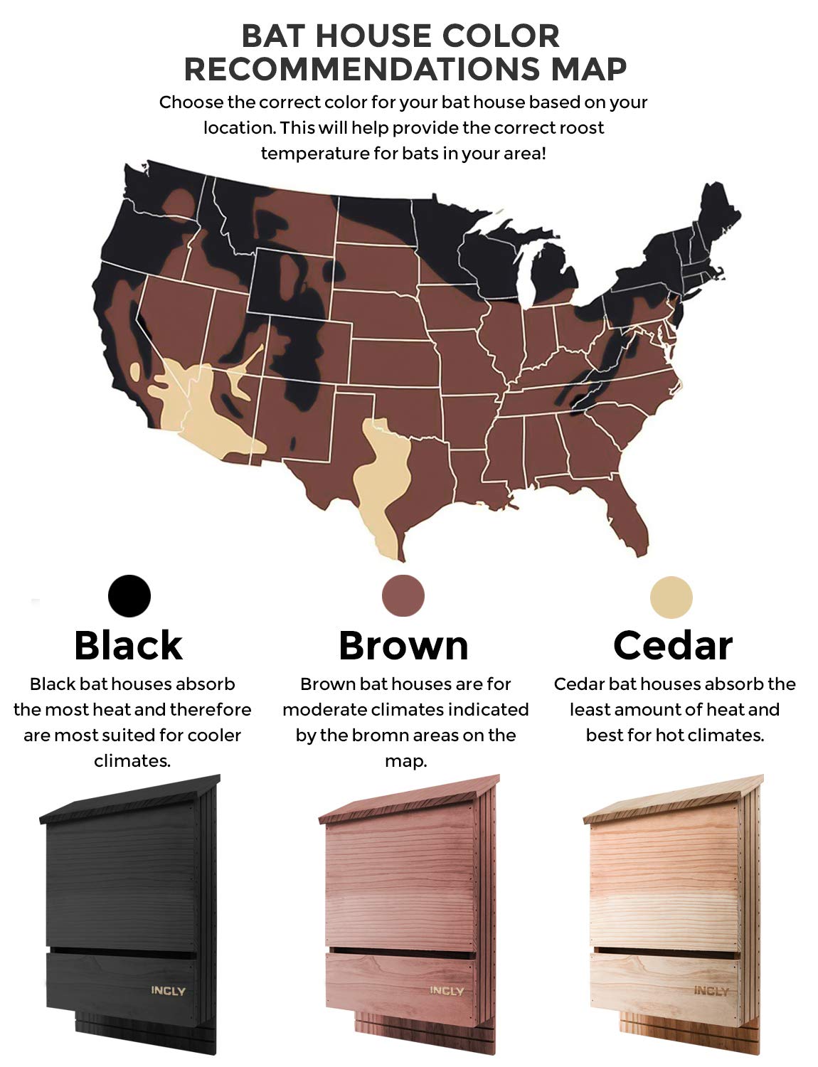 - Choose Right Color:The color of the bat house will effect the internal temperature,please choose the color according to our color map we provided.