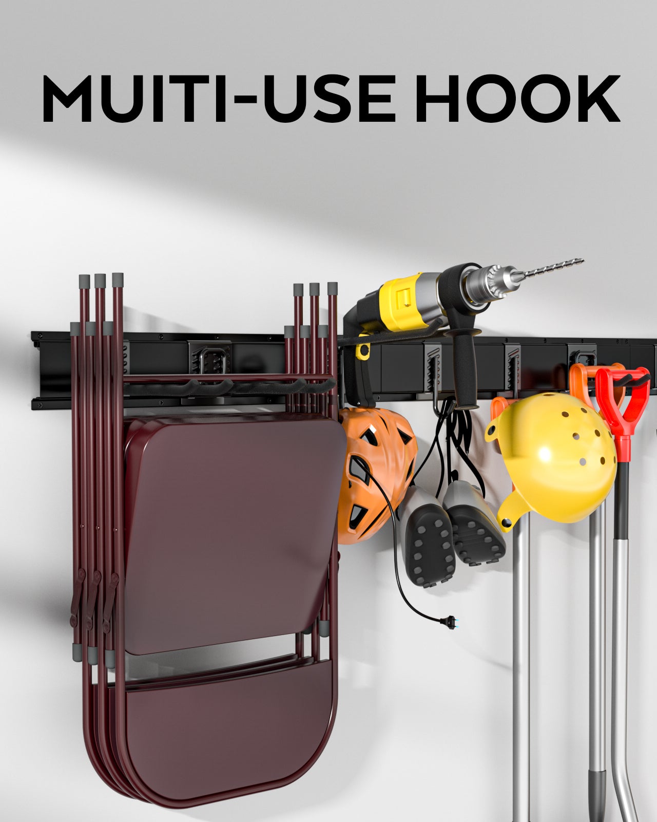 - EASY INSTALLATION & ADJUSTABLE: Use as individual 16 inch storage unit or combine for up to 64 inch storage length. Simply mount rack to wall studs via Included dowels and screws, garage storage hooks can be moved horizontally on the frame to accommodate different sized tools