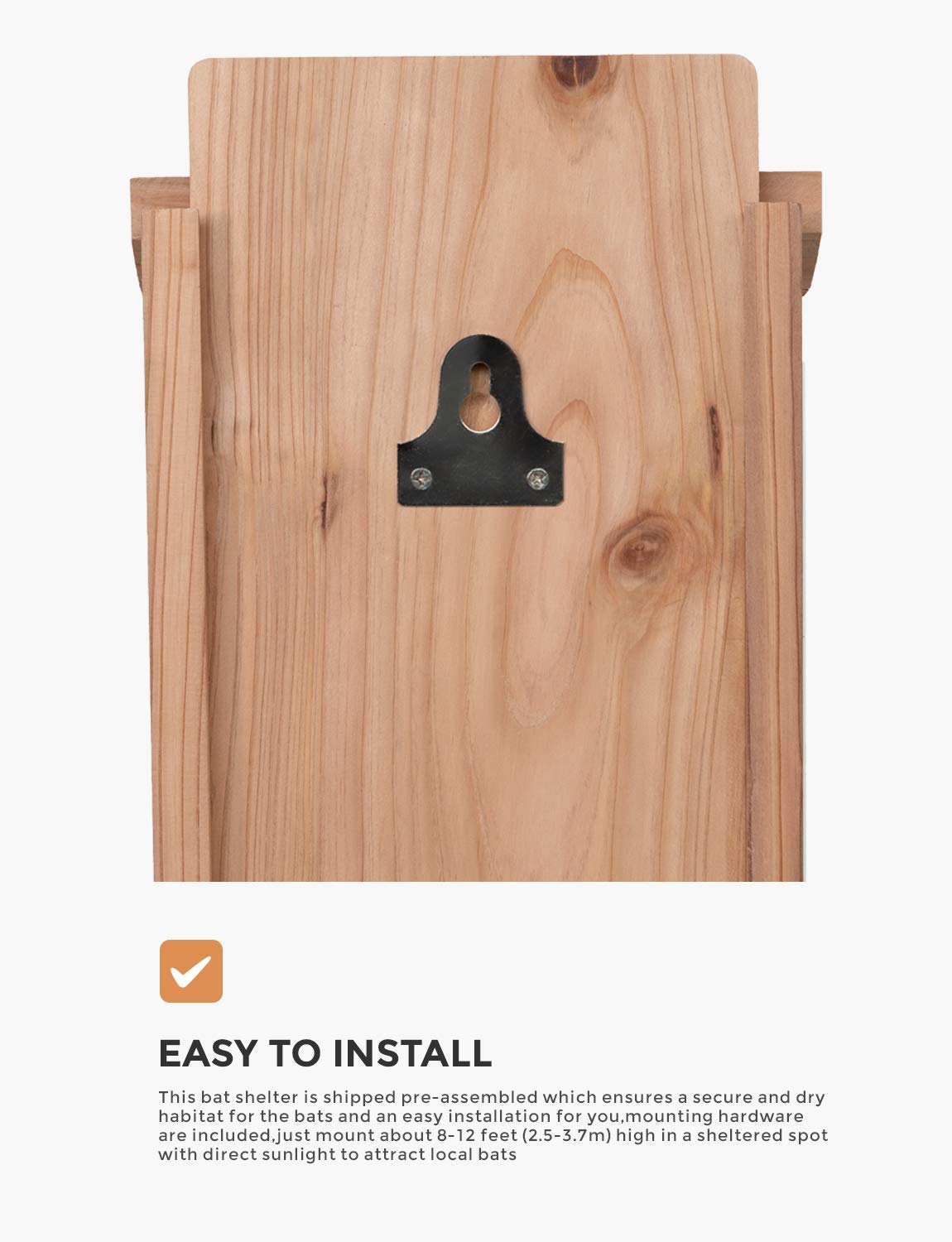 - 2.Easy to Install: This bat shelter is shipped pre-assembled which ensures a secure and dry habitat for the bats and an easy installation for you,mounting hardware are included,just mount about 8-12 feet (2.5-3.7m) high in a sheltered spot with direct sunlight to attract local bats